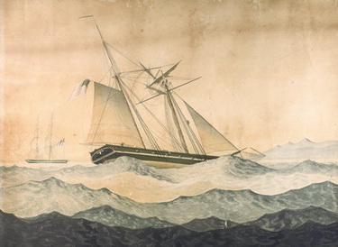 The U.S. Schoner (sic) SHARK crossing the bar off Lisbon. Watercolor by James Evans.