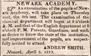 [2] “Childhood and youth of W. A. Whitehead 1810-1830.” A transcription of this memoir is held by the Florida History Department, Monroe County Public Library, Key West, Florida, and by the P. K. Yonge Library of Florida, George A. Smathers Libraries, University of Florida; page 8 of the transcription contains the references. The Academy’s fee structure was announced, together with Andrew Smith’s appointment, in The centinel of freedom (Newark, N.J.) 24 November 1818 3:4.