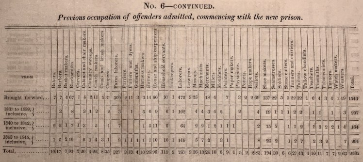 Gaddis’s report, compiled at the committee’s suggestion and using forms it provided, was printed by order of the state legislature. Copies were provided to all Historical Society members. The publication offered a demographic and criminological snapshot of the inmate population year by year, from the completion of the original State Prison in 1799 to the present time.5