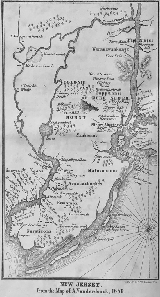 Even in the bloodier period of Dutch rule, these transactions consisted mostly of peaceful transfers of land to white settlers, who paid Indians in wampum and European-made trade goods, recording the exchanges in written deeds. In 1630, under patent from the Dutch West India Company, Michiel Pauw by such a purchase “secured an interest” in lands along the west shore of the Hudson river.7 This tract, which he named Pavonia, included Staten Island and the southern half of what became Hudson County. Pauw’s venture was less than successful, and his title reverted to the West India Company. By a 1659 deed, the Dutch obtained a far more extensive tract that included Pavonia; this time Whitehead remarked on the compensation made to the Indians, “sufficiently trifling under any circumstances,” and felt they’d allowed themselves to be swindled.8 When the prevailing peace between Natives and settlers was shattered, it was, Whitehead wrote, due to “the misconduct of the colonists.” The Indians of Pavonia, “more humane than their civilized opponents, spared the women and children” when retaliating for atrocities committed by the Dutch in 1643.9