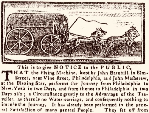 Two years later, O’Brien increased the frequency of his departures to twice weekly, and his success seems to have stimulated some competition. By the 1760s the New York and Philadelphia papers were carrying notices of “good stage wagons, and the seats set on springs,” making the trip in two days in summer, three in winter. “The wagons were modestly called ‘Flying Machines’,” noted Whitehead, “and the title soon became a favorite with all the stage proprietors.”14