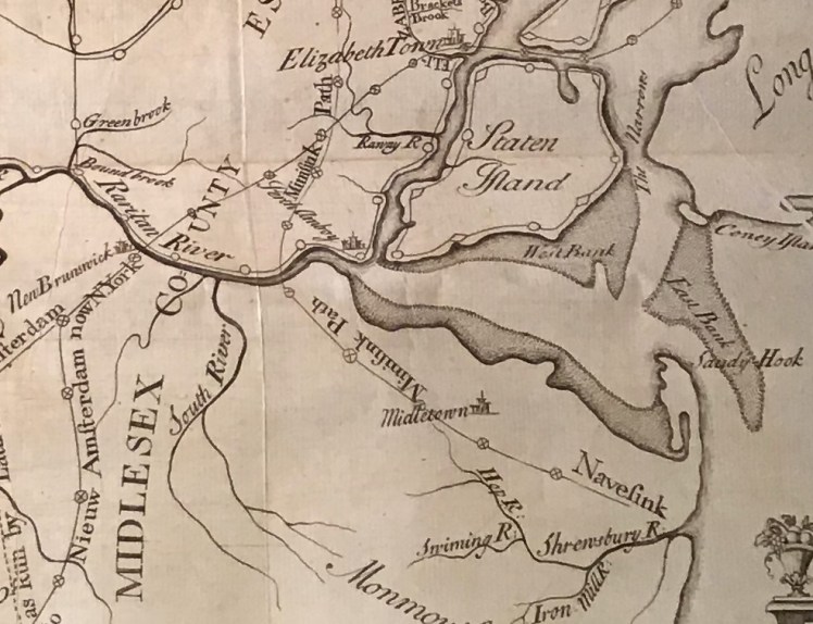 [2] Whitehead, East Jersey (18461) 25, (18752) 28. With slightly less imprecision, he placed the Minisink Path’s meeting with the Raritan “about three miles above Perth Amboy.” William A. Whitehead, Contributions to the early history of Perth Amboy and adjoining country, with sketches of men and events in New Jersey during the provincial era (New York 1856, hereafter “Whitehead, Contributions”) 268. Later writers have placed the crossing at Kent’s (or Kents) Neck on the north bank of the river near Crab Island: Charles D. Deshler, “Early roads,” in W. Woodford Clayton, History of Union and Middlesex Counties, New Jersey, with biographical sketches of many of their pioneers and prominent men (Philadelphia 1882) 431; Reginald Pelham Bolton, Indian paths in the great metropolis (New York 1922) 204; Charles A. Philhower, “The Minisink Indian Trail,” Proceedings of the New Jersey Historical Society n.s. 8:3 (July 1923) (199-205) 202; id., “Indian days in Middlesex County, New Jersey,” Proceedings of the New Jersey Historical Society n.s. 12:4 (October 1927) (385-405) 389.